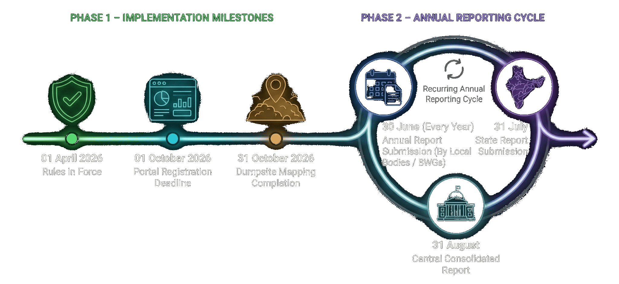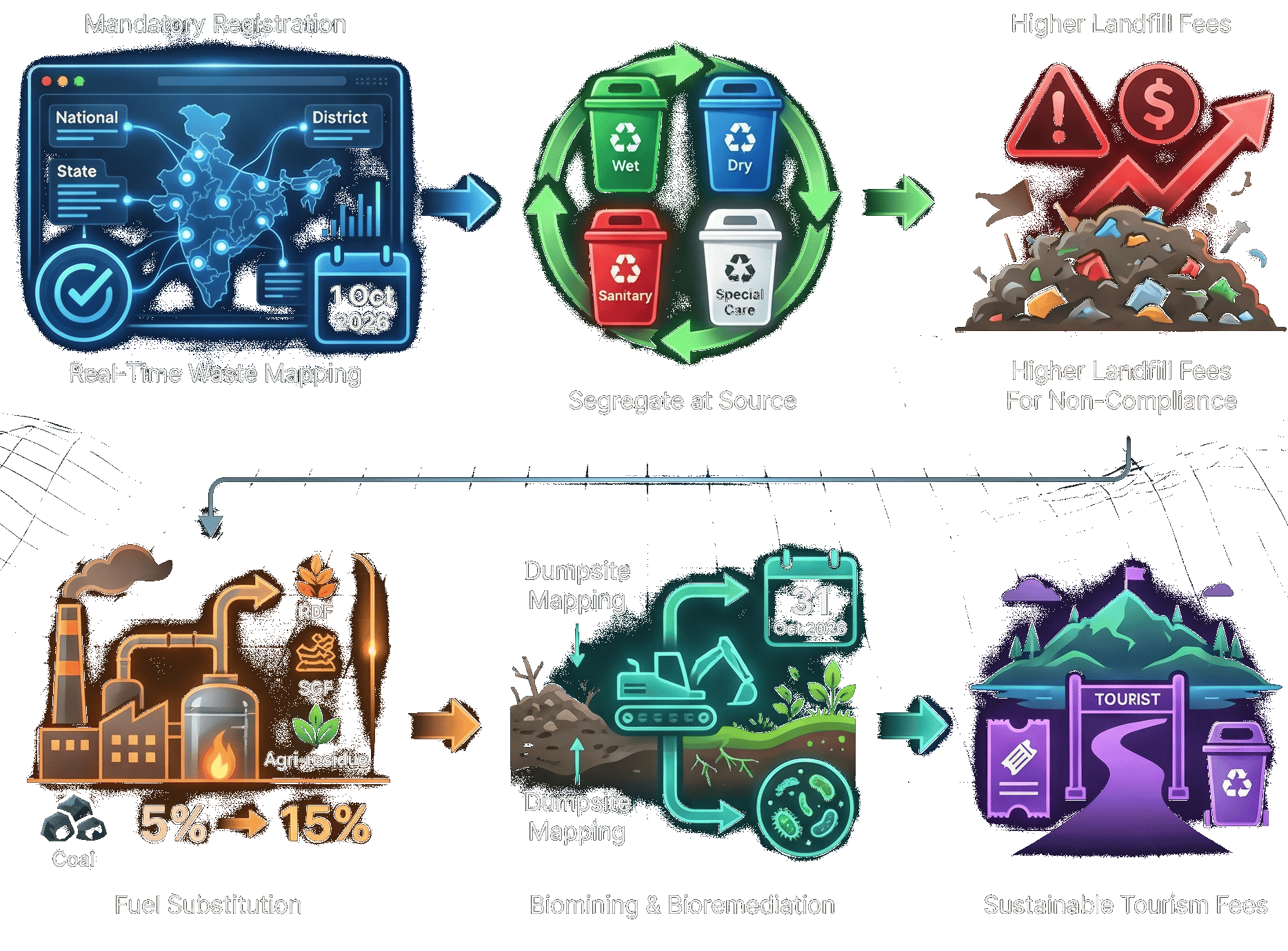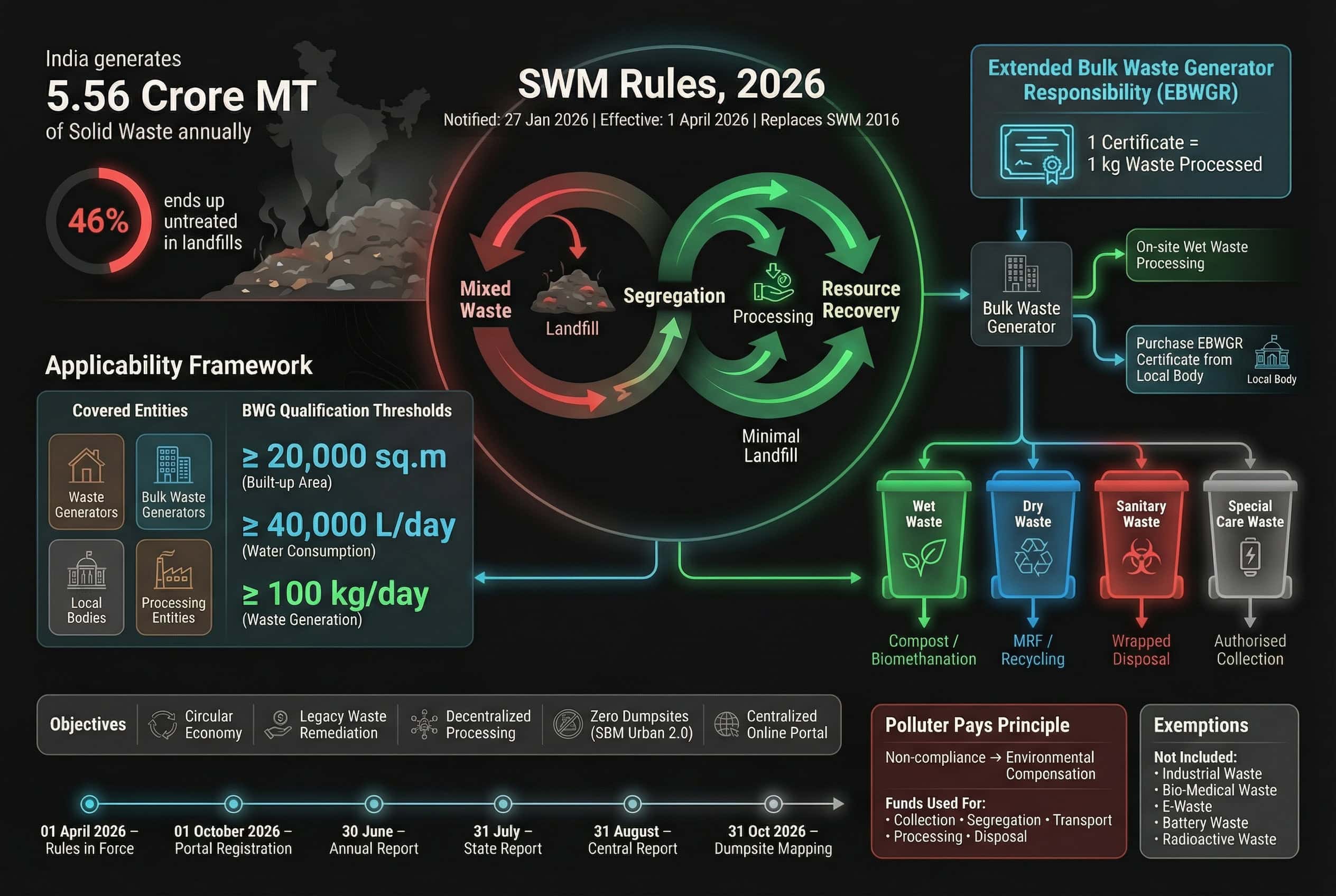 - Legacy Waste Remediation : All existing dumpsites must be geographically mapped and assessed by October 31, 2026, for time-bound biomining and bioremediation to clear old waste.