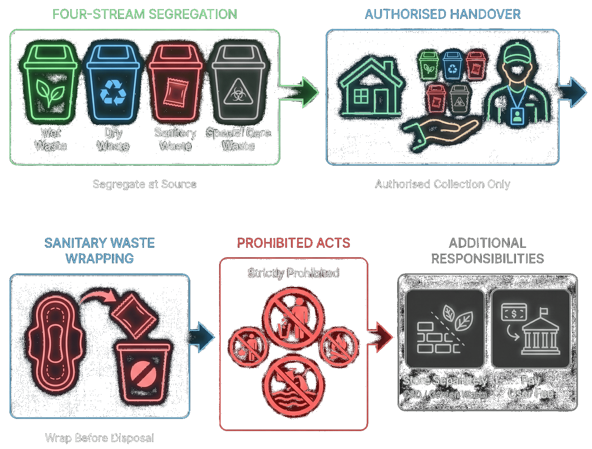 - Four-Stream Segregation: Generators must segregate waste into Wet, Dry, Sanitary, and Special Care (domestic hazardous) streams at the source.